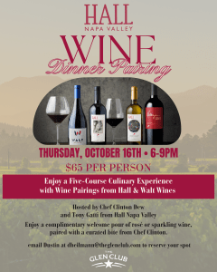 Join us for an exclusive Napa Valley Wine Dinner Pairing on Thursday, October 16th, from 6 pm to 9 pm, hosted by Chef Clinton Dew and Tony Gatti of Hall Napa Valley.