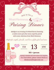 Join us for a memorable Valentine’s pairing dinner featuring a multi-course prix fixe menu paired with exceptional wines from Moët Hennessy. An intimate evening of fine flavors, perfect pairings, and unforgettable moments awaits.